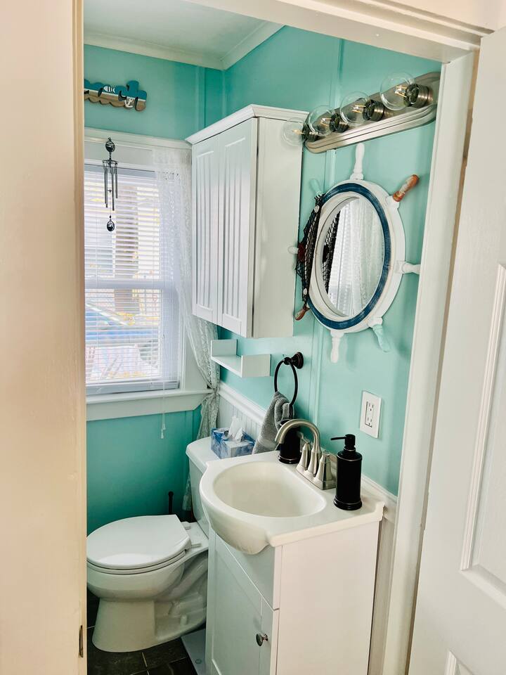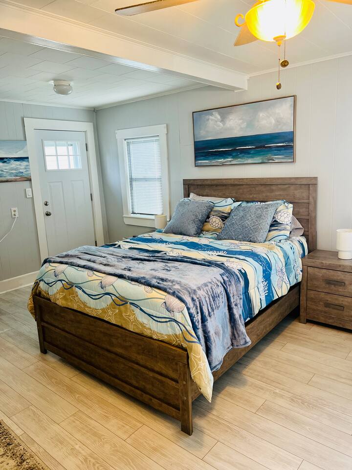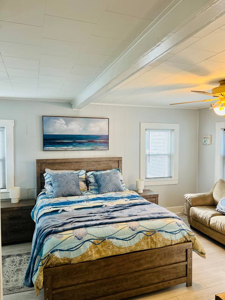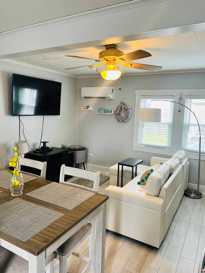 Discover our charming 1-bedroom cottage, The Ocean Breeze, a perfect retreat for a quick getaway. Whether it's a romantic escape or you're in town for a show or night out, this cozy space is an ideal choice. Comfortably accommodating up to 4 guests, the master bedroom features a queen-size bed and a full-size futon. The living room has a sectional sofa sleeper with a storage chaise, providing additional sleeping space. Experience the convenience and relaxed atmosphere of our cottage, making your stay both memorable and effortlessly comfortable